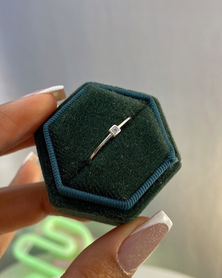 Com design delicado e sofisticado, este anel é feito em prata 925 e possui uma pequena pedra quadrada central com brilho discreto. Perfeito para quem busca um acessório minimalista, elegante e versátil para o dia a dia. É antialérgico, leve e combina com diferentes estilos.